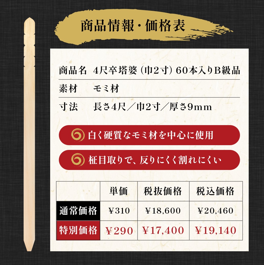 お盆・お彼岸・法事など、故人を偲ぶ大切な行事に欠かせない「卒塔婆」。 当店では、高品質な卒塔婆をご提供させていただくために必ず職人が商品の出来栄えをチェックいたします。 また、持ちやすく、手に優しい『面取加工』を施した後、筆の走りを良くする『両面超仕上げ』加工を施しております。 表面削りの良さとまるで筆が吸い付くような書き心地をぜひご体感ください。
