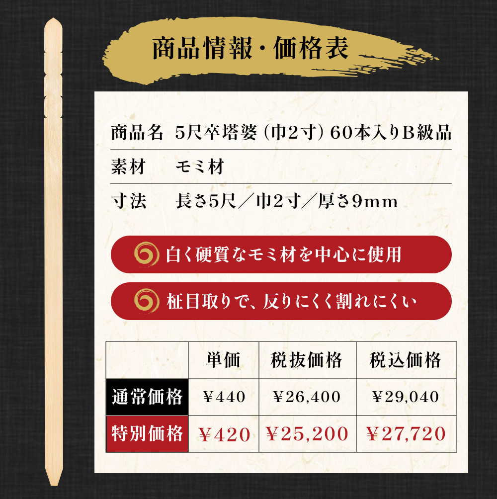 お盆・お彼岸・法事など、故人を偲ぶ大切な行事に欠かせない「卒塔婆」。 当店では、高品質な卒塔婆をご提供させていただくために必ず職人が商品の出来栄えをチェックいたします。 また、持ちやすく、手に優しい『面取加工』を施した後、筆の走りを良くする『両面超仕上げ』加工を施しております。 表面削りの良さとまるで筆が吸い付くような書き心地をぜひご体感ください。