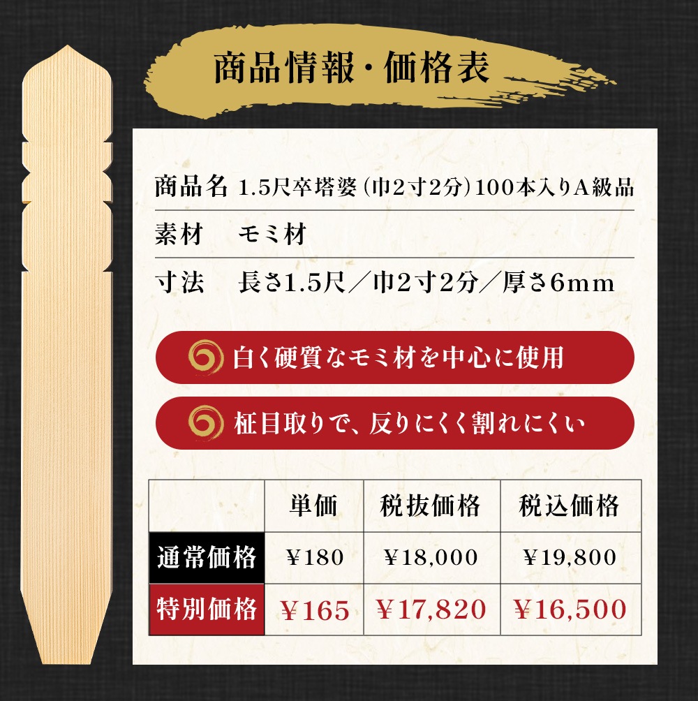 お盆・お彼岸・法事など、故人を偲ぶ大切な行事に欠かせない「卒塔婆」。 当店では、高品質な卒塔婆をご提供させていただくために必ず職人が商品の出来栄えをチェックいたします。 また、持ちやすく、手に優しい『面取加工』を施した後、最後に筆の走りを良くする『両面超仕上げ』加工を施しております。 表面削りの良さとまるで筆が吸い付くような書き心地をぜひご体感ください。 ※下平(塔婆の下部分に切り込みがないもの)を希望の方はご購入画面にて該当の項目にチェックください。