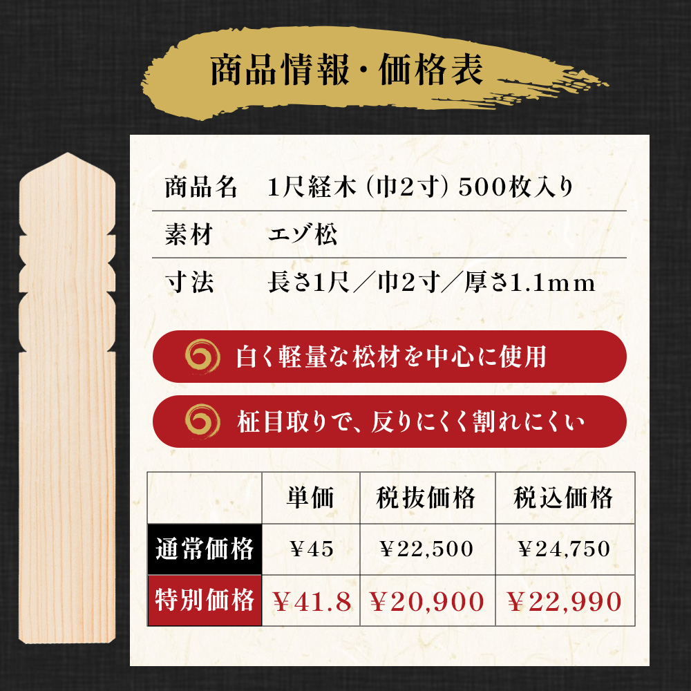 お盆・お彼岸・年回忌法要などの仏事に欠かせない「経木」。 当店では、高品質な経木をご提供させていただくために、一本一本職人が丁寧に仕上げ加工を施しております。 また、筆の走りを良くする『両面超仕上げ』加工を施しております。 ご住職様の負担を少しでも軽くしつつ、筆がすっと走るなめらかな書き心地をぜひご体感ください。 ※常商品と産地が違う材料を入手したため、特別価格での販売です。 ※通常品希望の方は、通常品の注文フォームでお願いします。